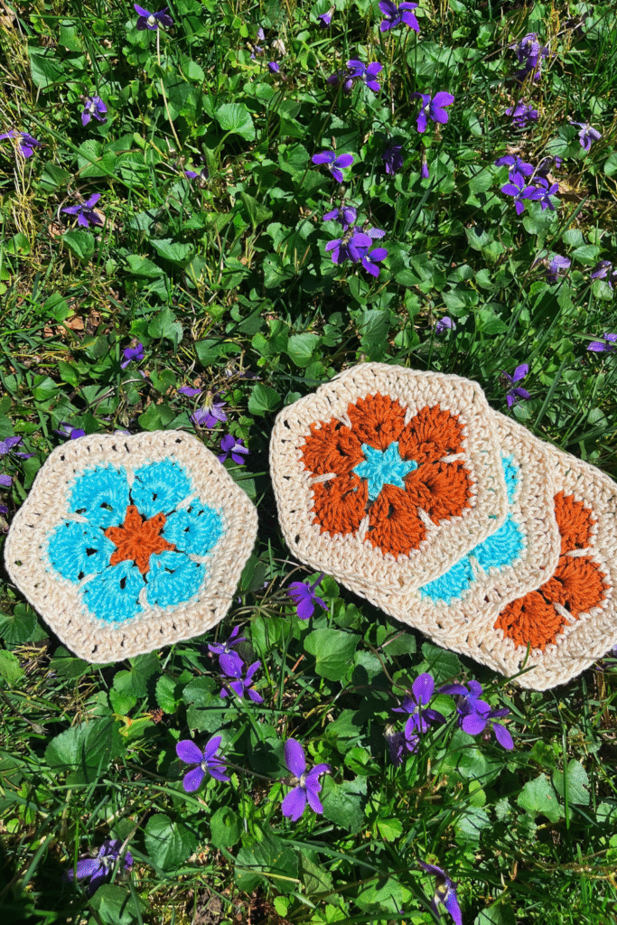 Another one of my new favorites I have discovered this yea is the African Flower Granny Square. I was so mesmerized by how unique this flower motif looked that I immediately got into it! I ended up creating a few different sets of 100% cotton coasters that look absolutely STUNNING! My absolute favorite set is the Turquoise set, but I’m thinking of connecting the rest of these hexagons and making a table runner for the Summer! For this project I used 24/7 Cotton from Lion Brand – I won’t list all of the colors I used here, keep your eyes out for a future tutorial and pattern drop for that info!